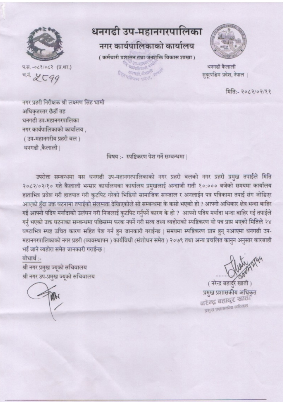 उपमहानगरपालिकाद्वारा स्पष्टीकरण माग