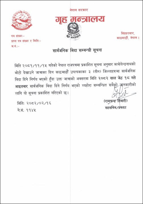 काठमाडौं : काठमाडौं उपत्यकामा यस आइतबार (जेठ १८ गते, २०८२) सार्वजनिक बिदा हुने भएको छ। गृहमन्त्रालयका प्रवक्ता एवं सहसचिव रामचन्द्र तिवारीले मच्छिन्द्रनाथको भोटो देखाउने जात्राका अवसरमा काठमाडौं, ललितपुर र भक्तपुर जिल्लामा बिदा दिइएको जानकारी दिएका छन्।