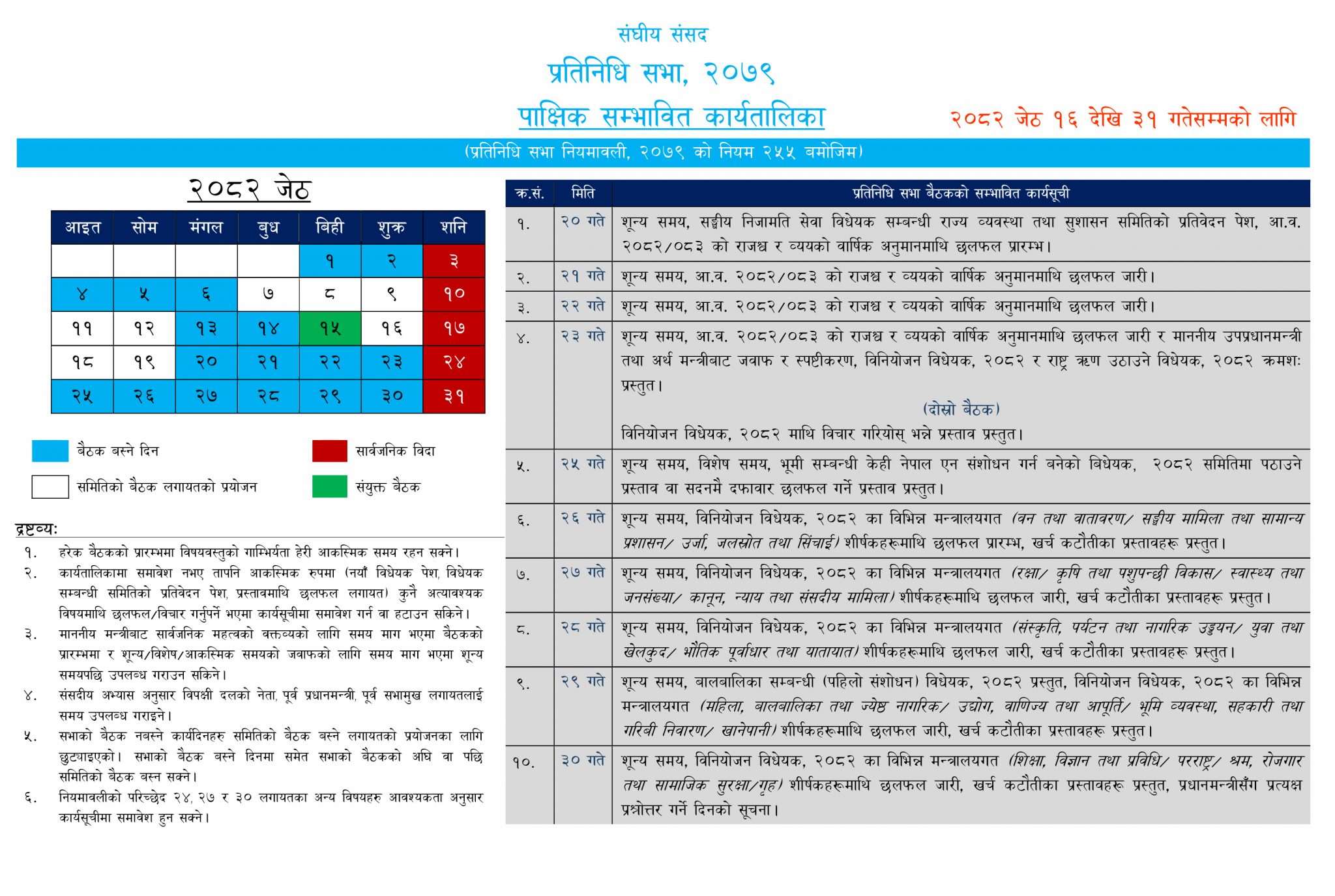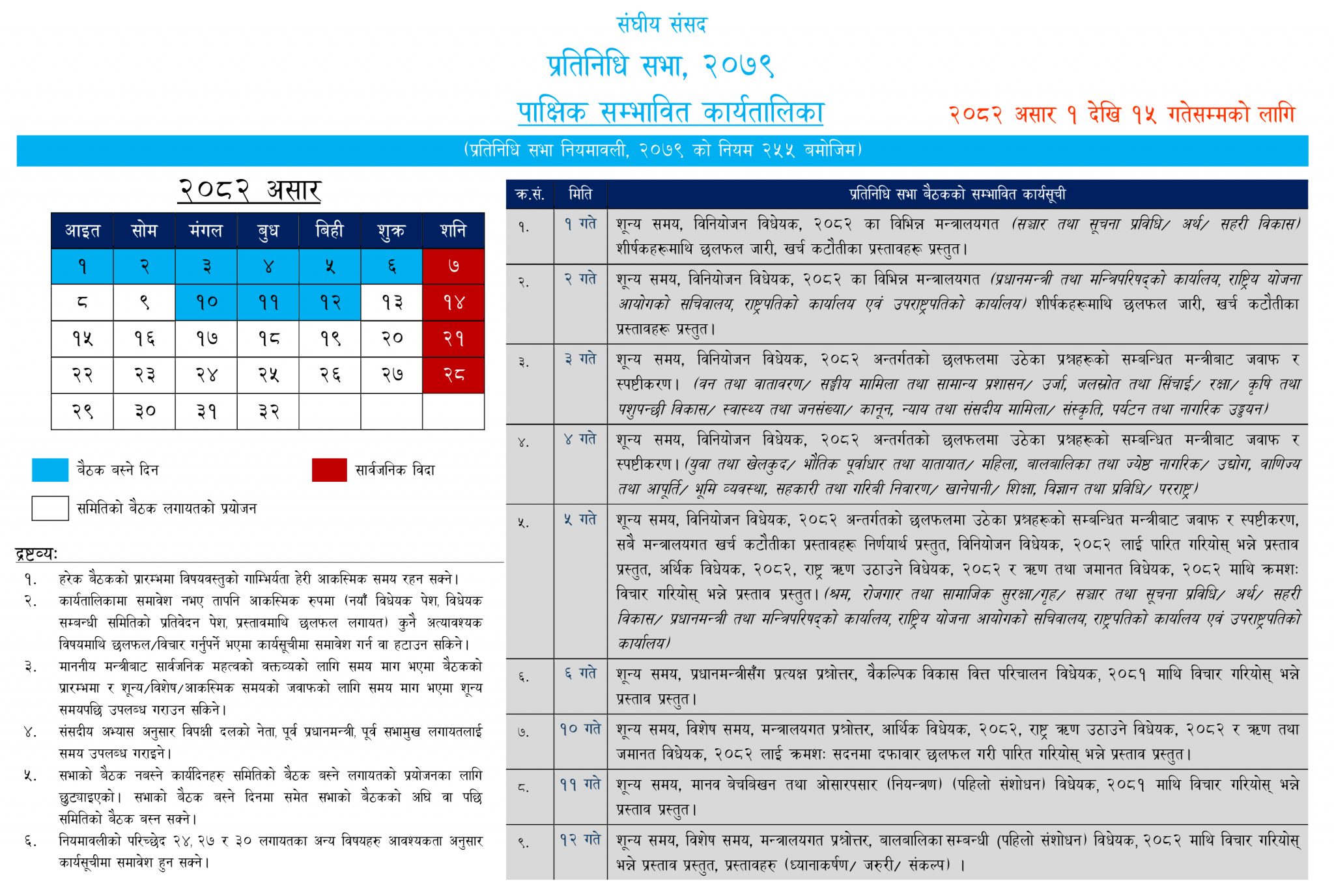 काठमाडौं : संघीय संसद सचिवालयले प्रतिनिधिसभाका आगामी बैठकहरूको पाक्षिक सम्भावित कार्यतालिका सार्वजनिक गरेको छ। कार्यव्यवस्था समितिको बैठकले जेठ १६ देखि ३१ गतेसम्म र असार १ देखि १२ गतेसम्मको सम्भावित कार्यसूचीलाई अन्तिम रूप दिएको हो। यस अवधिमा कुल १९ वटा बैठक बस्नेछन् — जेठको बाँकी दिनमा १० वटा र असार १२ सम्म ९ वटा बैठक निर्धारित गरिएका छन्।