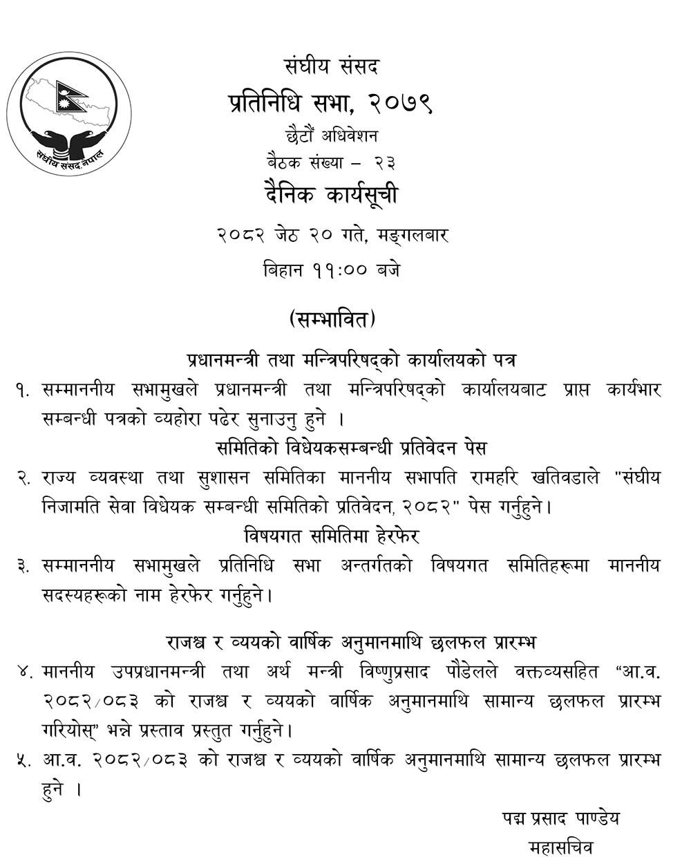 बिहान ११ बजेदेखि बस्ने बैठकमा जेठ १५ गते अर्थमन्त्री विष्णुप्रसाद पौडेलले प्रस्तुत गरेको बजेटमाथि छलफल प्रारम्भ हुने तालिका रहेको छ ।सभामुख देवराज घिमिरेले बजेटमाथिको छलफल तथा अर्थमन्त्री पौडेलले जवाफ दिनका लागि जेठ २०, २१, २२ र २३ गतेका लागि तोकेका छन् ।