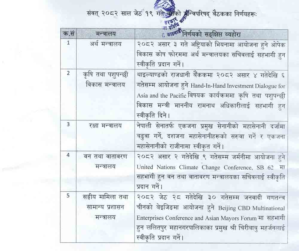 काठमाडौँ :  मन्त्रिपरिषद्को जेठ १५ र १९ मा बसेको बैठकका निर्णयहरु सार्बजनिक गरिएको छ ।