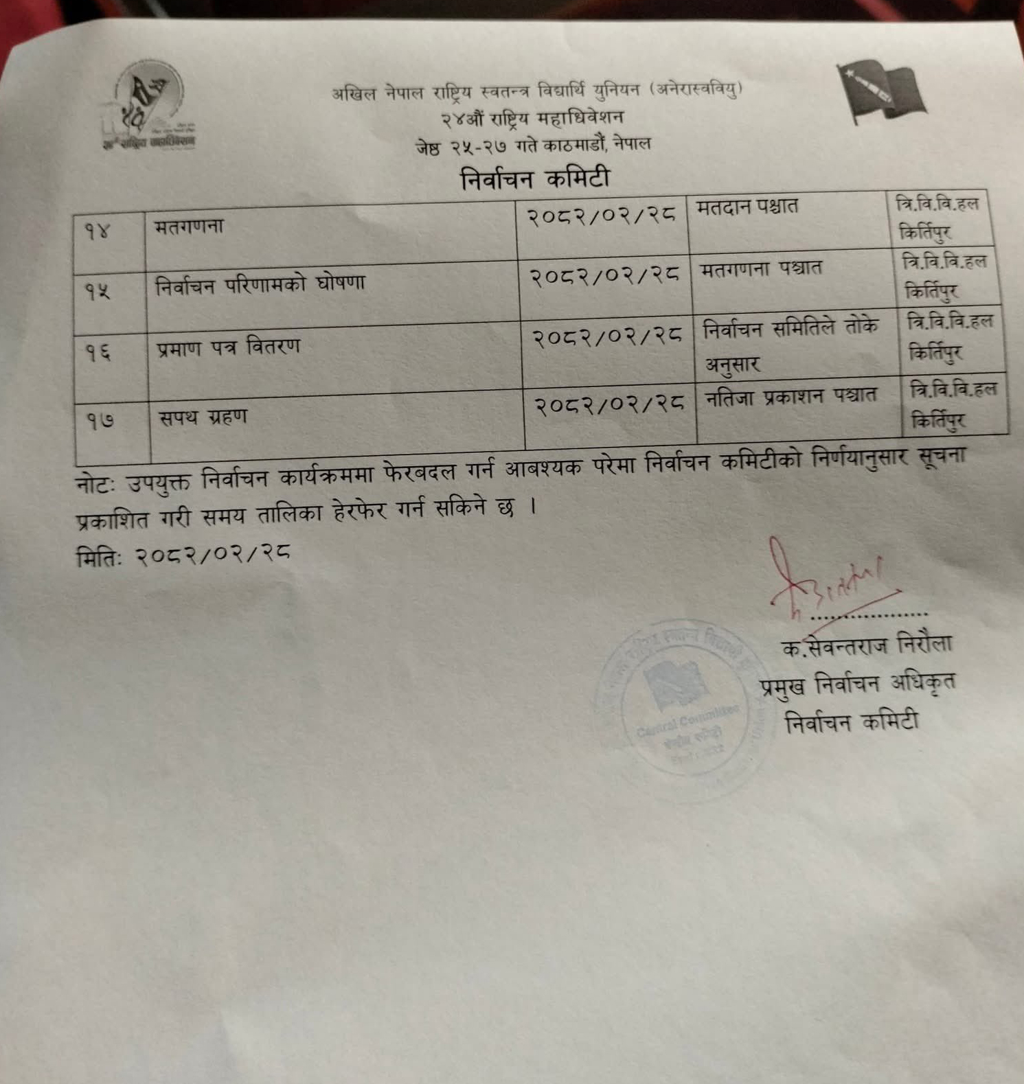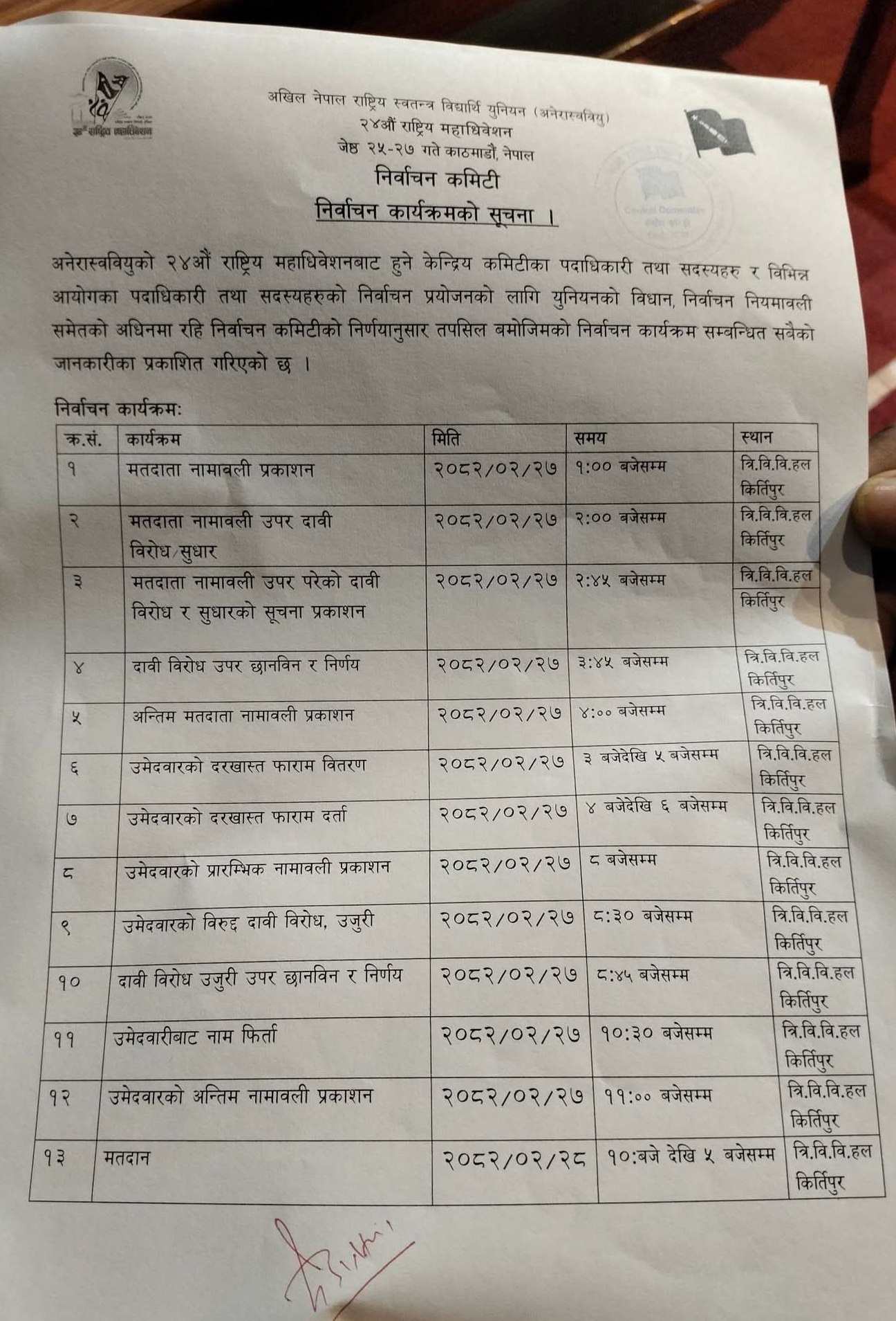 काठमाडौं : नेकपा एमालेको विद्यार्थी भ्रातृ संगठन अखिल नेपाल राष्ट्रिय स्वतन्त्र विद्यार्थी युनियन (अनेरास्ववियु) को जारी अधिवेशनमा सहमतिबाट नेतृत्व चयन गर्ने प्रयास असफल भएपछि निर्वाचन समितिले कार्यतालिका सार्वजनिक गरेको छ। बन्द सत्रमा अध्यक्षमण्डलले पदाधिकारीको नाम प्रस्ताव गरेलगत्तै असन्तुष्ट पक्षले नाराबाजी गर्दै निर्वाचन प्रक्रियामा जानुपर्ने माग गरेपछि यो निर्णय गरिएको हो।