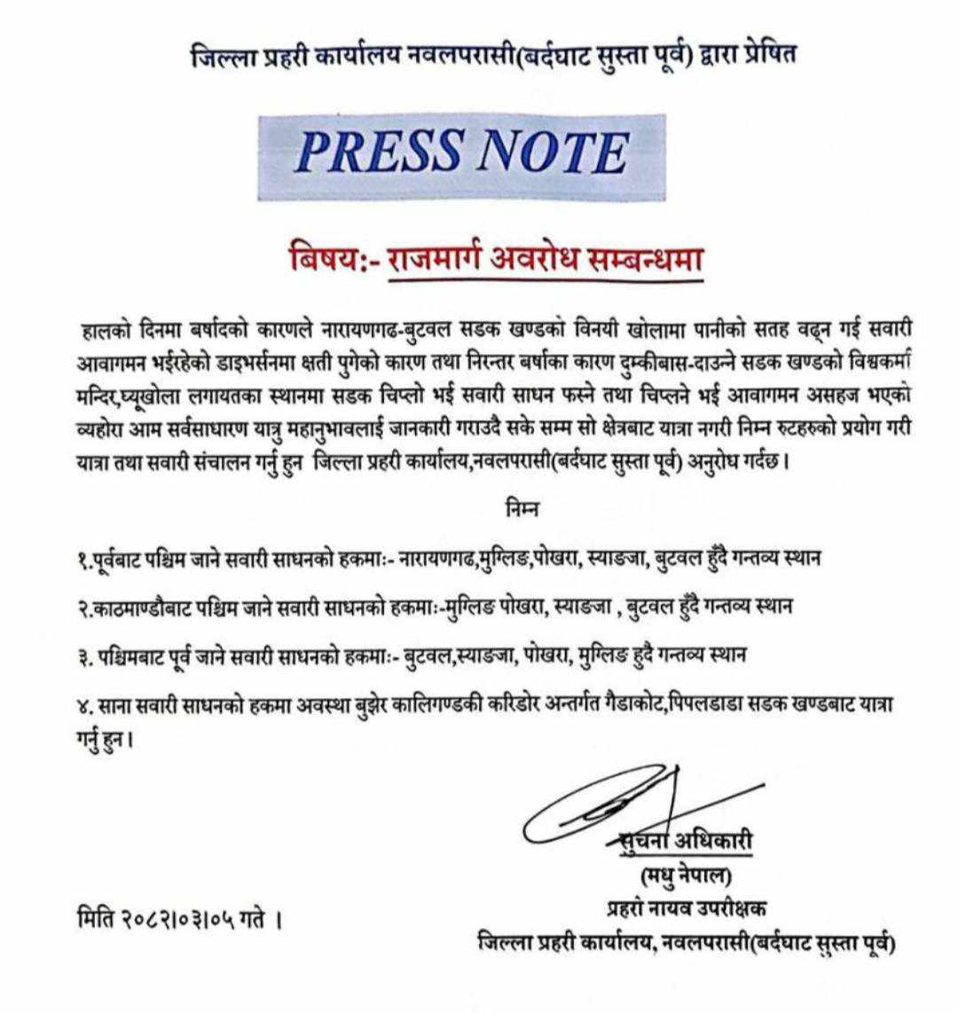 जिल्ला प्रहरी कार्यालय, नवलपरासी (बर्दघाट सुस्ता पूर्व) का सूचना अधिकारी मधु नेपालले बिहीबार एक सूचना जारी गर्दै यात्रुहरूलाई वैकल्पिक मार्ग प्रयोग गर्न अनुरोध गरेका छन्।
