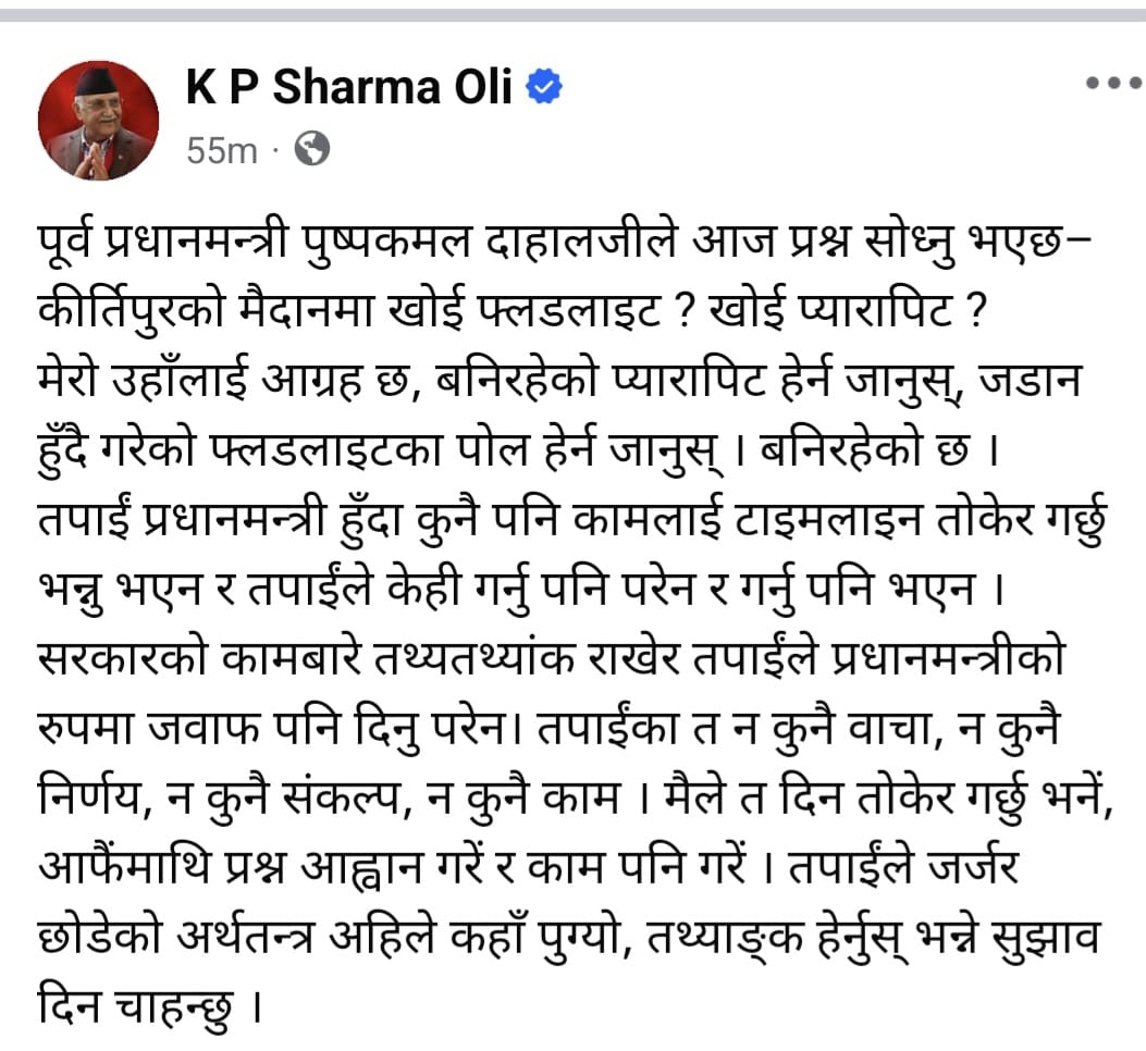 प्रधानमन्त्री केपी शर्मा ओलीले लेखेको स्टाटस :