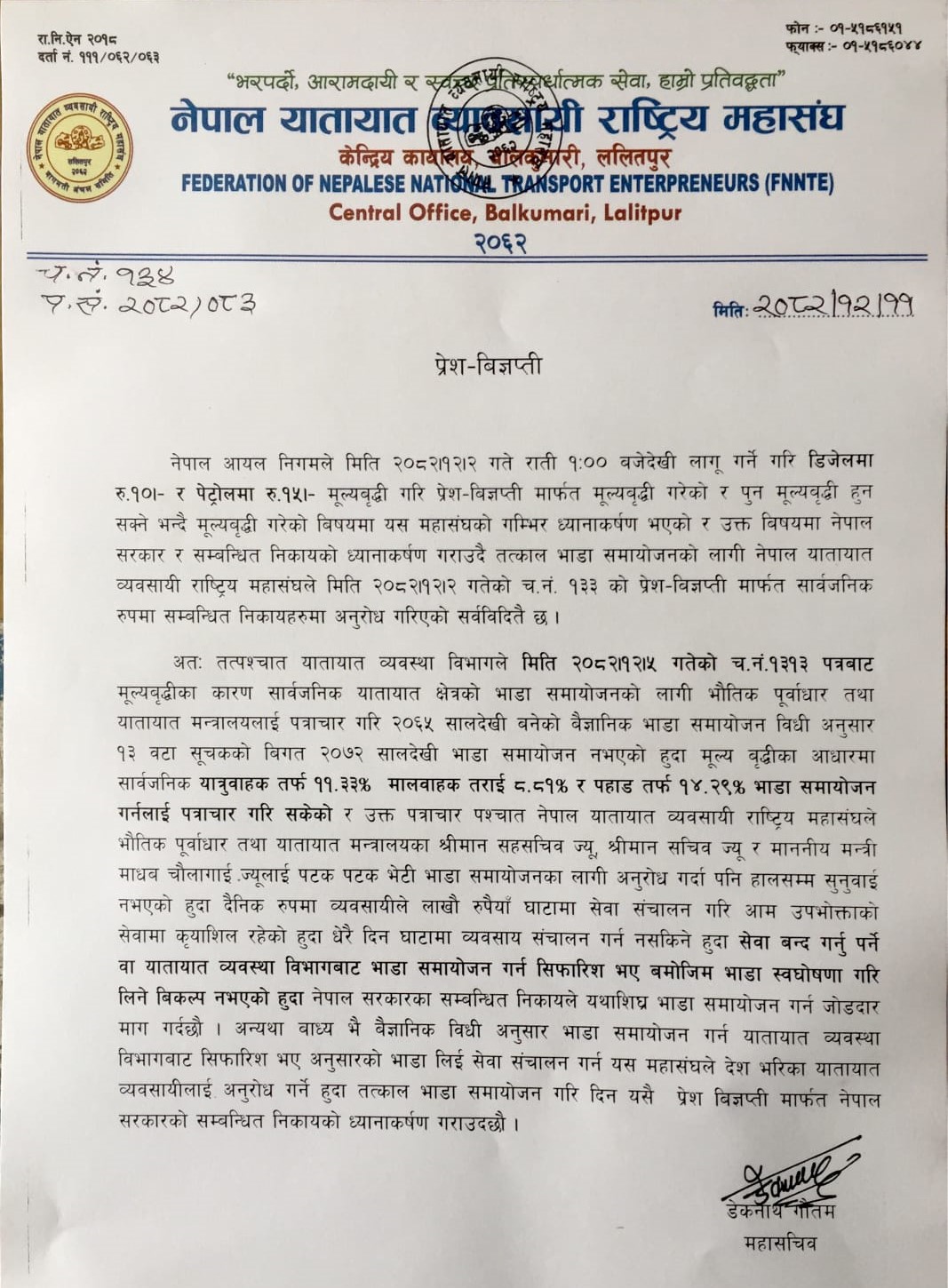 नेपाल यातायात व्यवसायी राष्ट्रिय महासंघले भाडा बढाउन अन्तिम चेतावनी दिँदै सो कुरा बताएको हो । आयल निगमले छोटो अन्तरालमै तीन पटकसम्म डिजेल र पेट्रोलको मूल्य बढाएर पनि सवारी साधनको भाडा नबढेकोले तत्काल नै भाडा वृद्धि गर्न माग गरेको हो ।